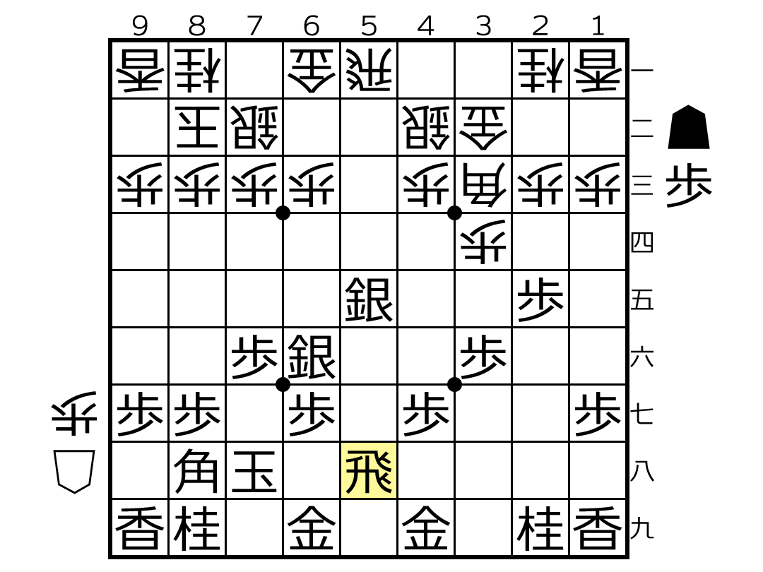 ☖5五同角(第2図)に☗1八飛と逃げる手は☖2八銀で後手が指せる。なので先手は☗1八飛打(第4図)と飛車の重ね打ちで受ける手が最善手と言われています。図では☖5六歩と垂らす手が定跡で、以下☗2四歩☖同歩☗同飛☖2三歩☗2五飛で互角の形勢。