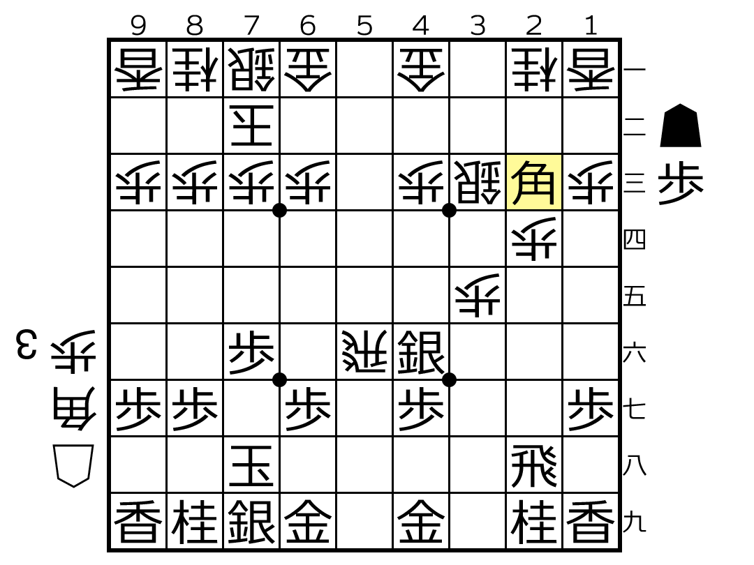 第7図は、第1図から☗2四歩〜☗3五歩と突き捨てて☗2三角と打った局面。本テーマである☖3二銀型急戦に対する先手第二の手段で、自陣に馬を作って指す狙いがある。図は飛車と金の両取りなので後手は☖5一飛と引く一手。