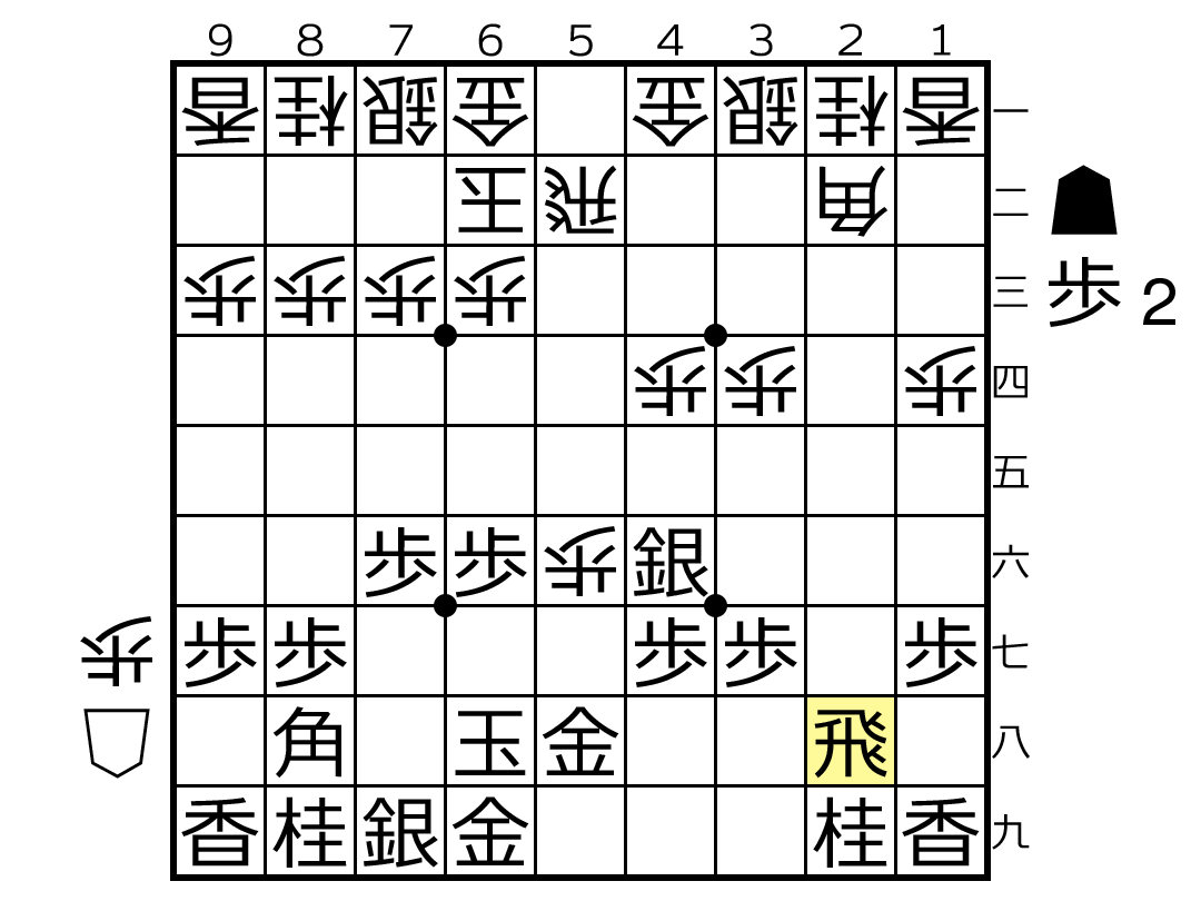 テーマ図以下☗2四歩☖同歩☗同飛に後手が☖3二金とすると、第2図またはそれに近い局面までは進む。形勢自体に大きな差はないが、後手に主張がないので面白くない。第2図の形勢は先手良し。評価値は先手に+200点ほど振れる。先手は穴熊を目指すなら☗6六歩、急戦志向なら☗6八銀が考えられる。