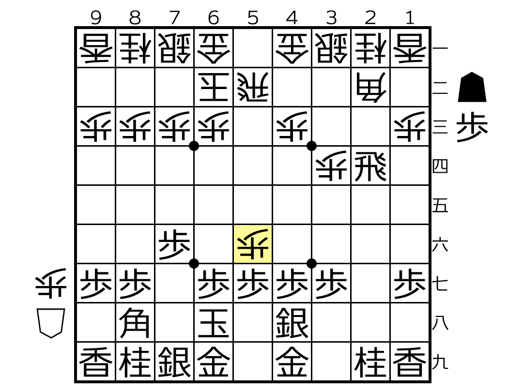 第3図の☖5六歩には☗6六歩と突くのが定跡。以下☖5六歩のときに先手には☗4八銀(第4図)と下に逃げる手と、☗4六銀(第7図)と上に逃げる手がある。市販の定跡書には☗4八銀が解説されていて、公式戦の実戦例も☗4八銀が圧倒的に多い。ただしAIは最善手を☗4六銀と示す。