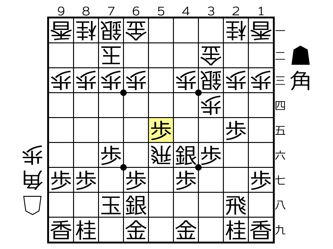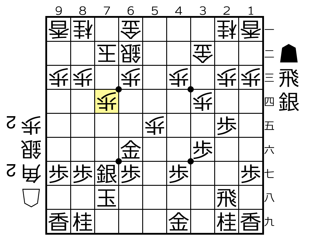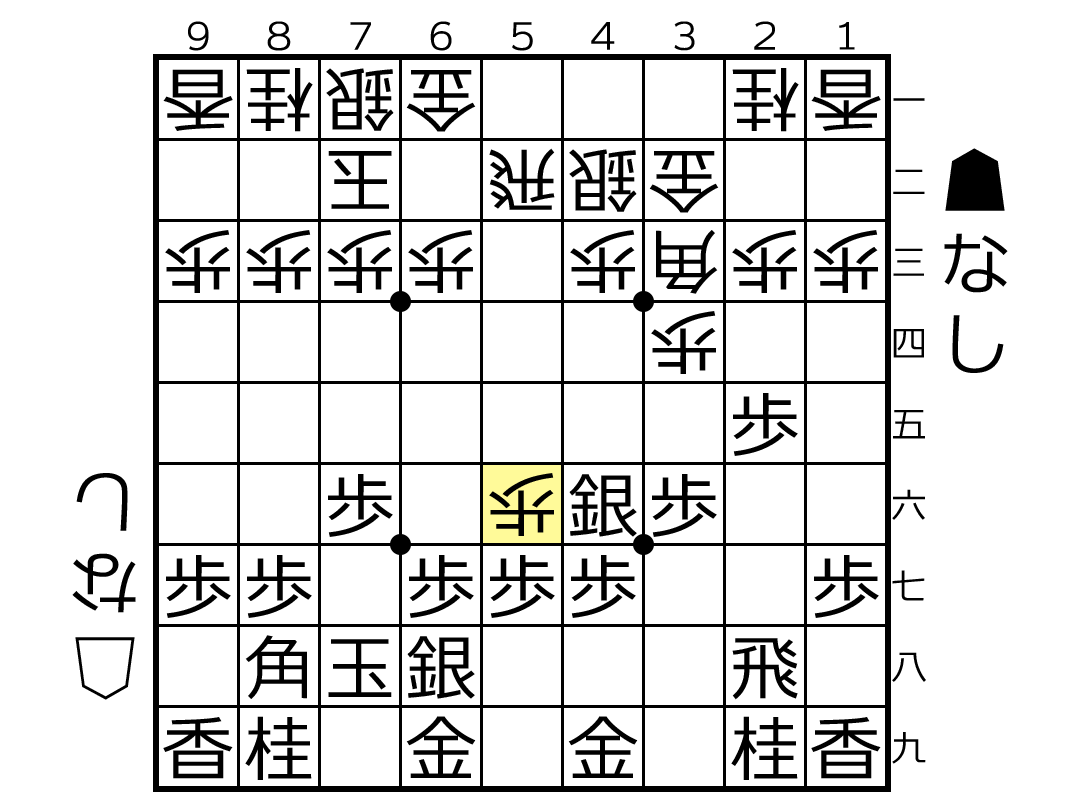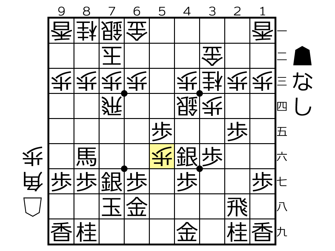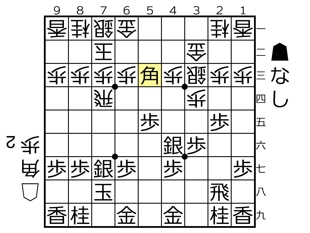 先手は☗8六角成と馬を作れたものの、☖5六歩と垂らされた第3図は後手十分の形勢になる。第3図では次に☖4五桂と跳ねる手があり、この桂馬が先手の銀との交換になれば後手が十分になる。