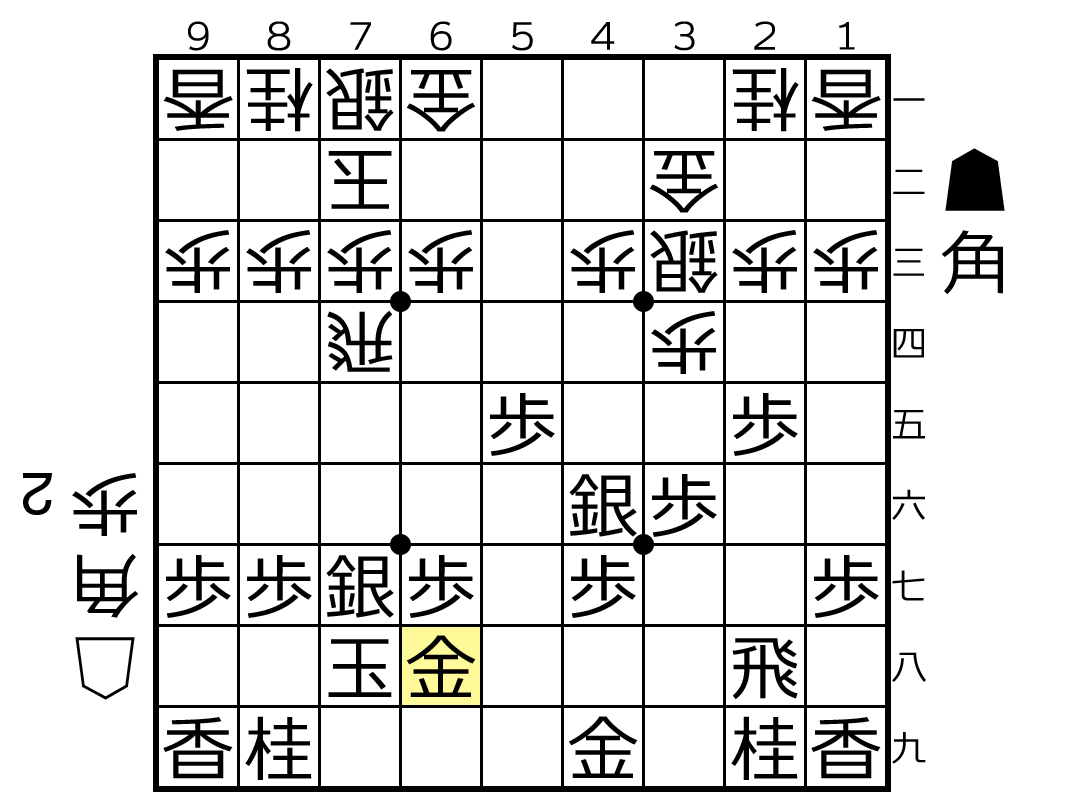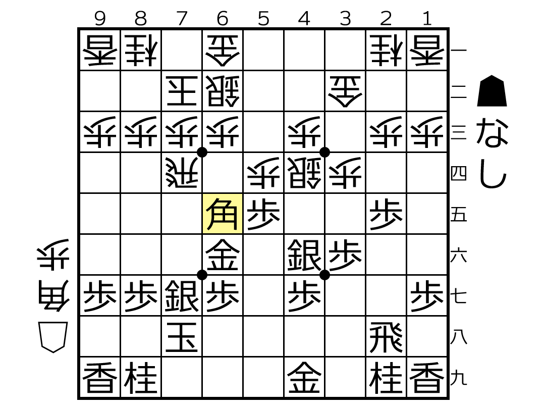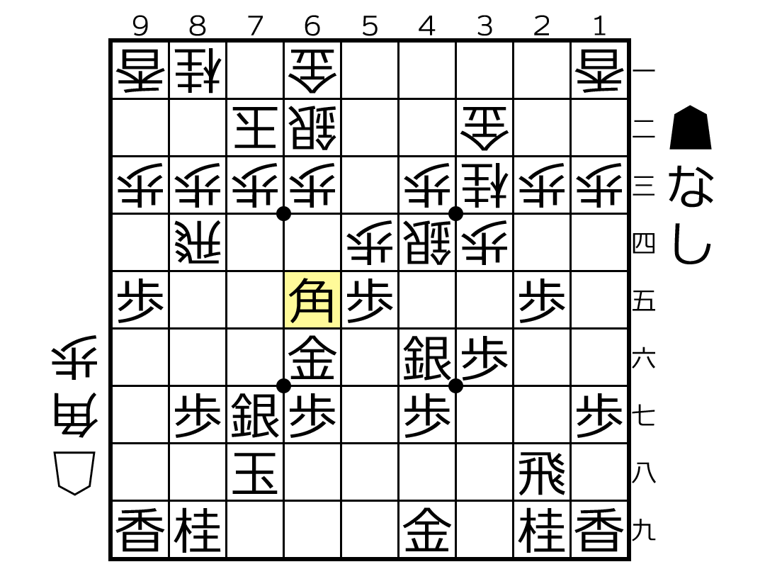 先手は☗5六角(第6図)と打ち飛車を取りにいくのが定跡。この手に代えて☗6五金と金で飛車取りに行くのは危険で、☖5六歩〜☖4五桂の反撃を喫する。先手陣は金銀がバラバラで薄いので、後手の反撃には十分注意する必要がある。