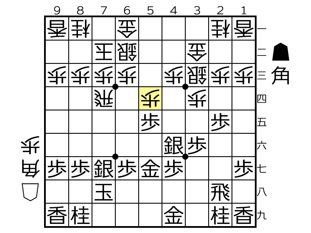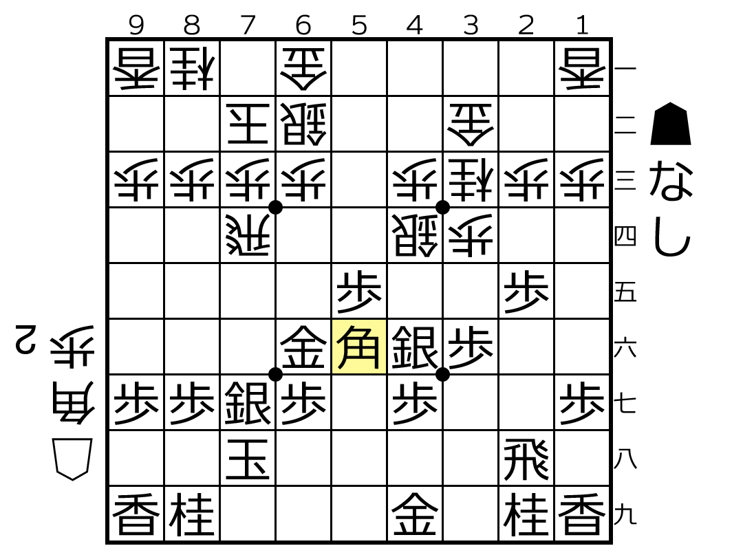 まずは第1図から先手が馬を作りに行く変化を見ていく。☗5三角(第2図)と打てば左右どちらかに馬を作ることができる。一般的に序盤戦での馬の存在は大きく、無条件に馬を作れるのなら多くの場合悪手にはなりづらいが、この場合は後手の反撃が厳しく後手十分の形勢になる。