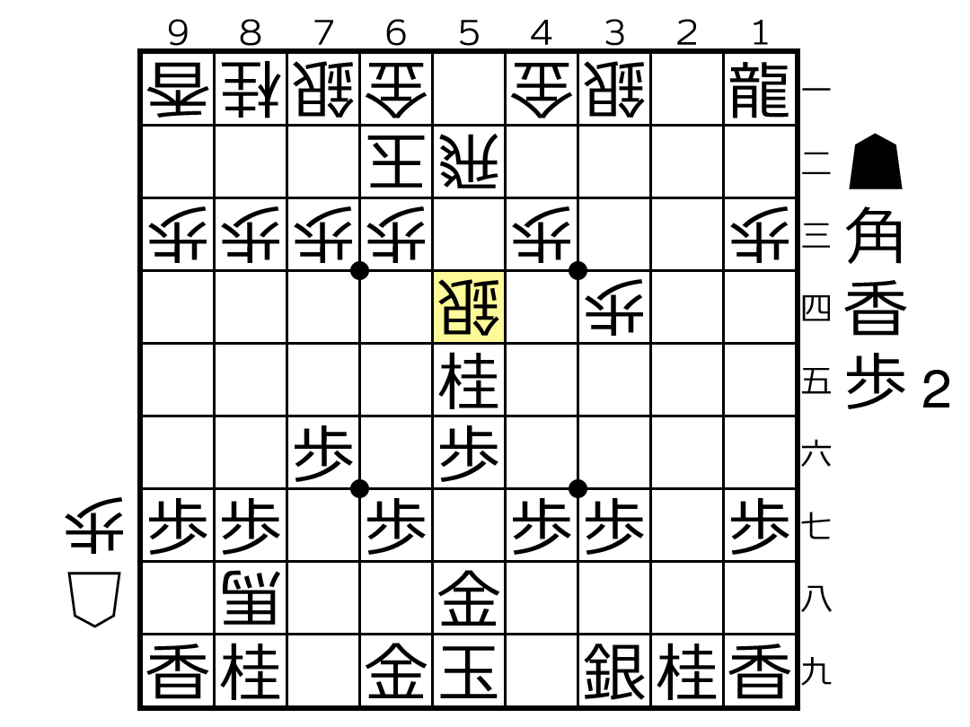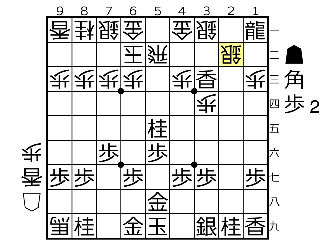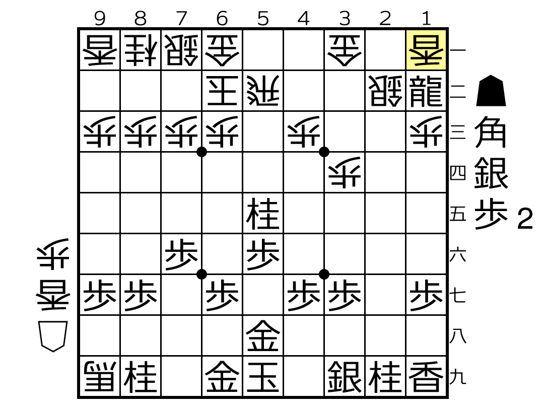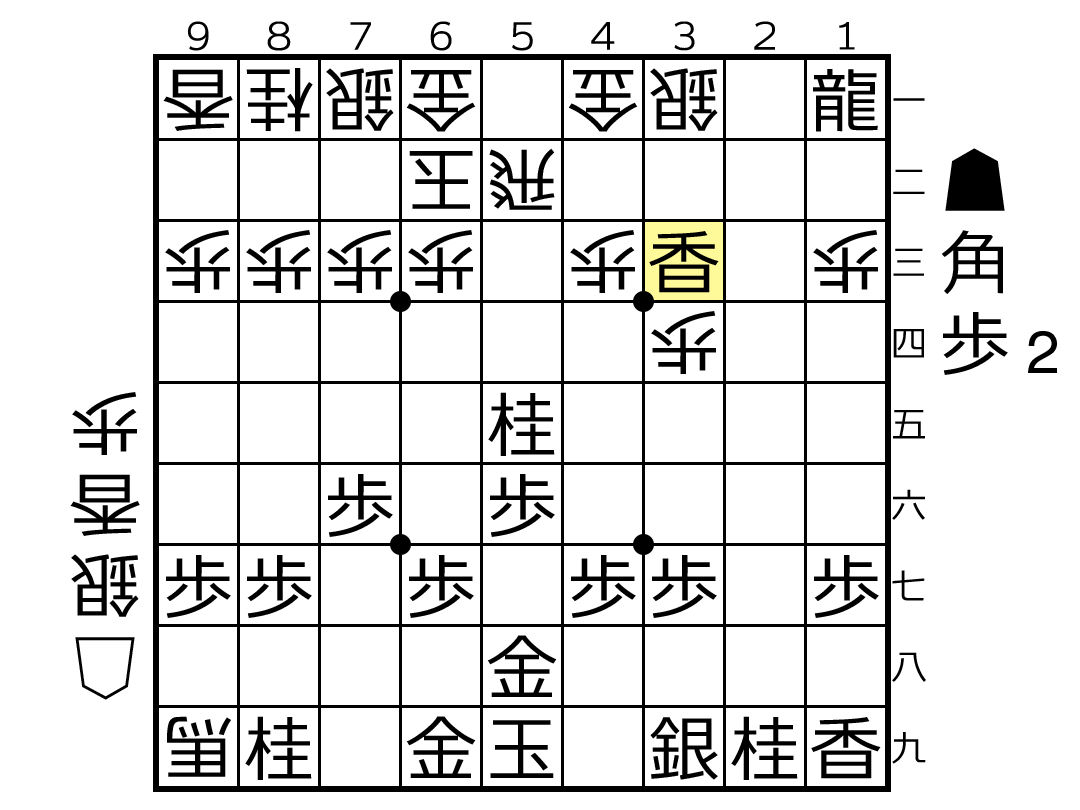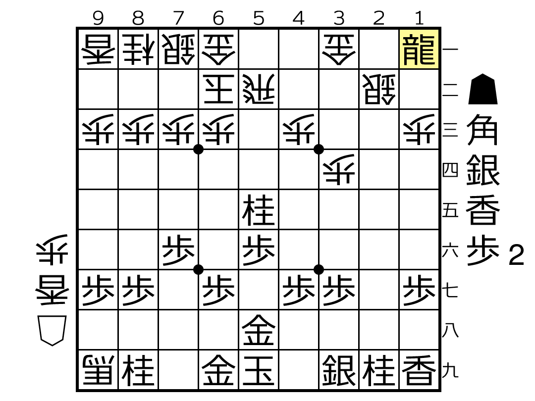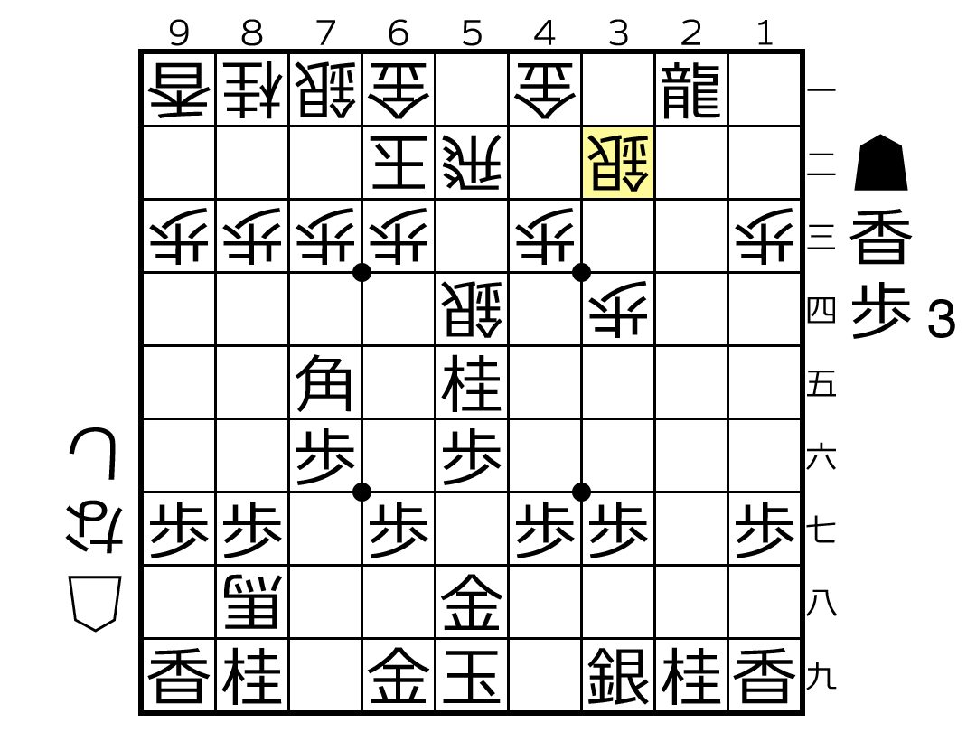 後手は☖1一香と打って竜を捕獲するのが定跡。ここで他の手を指すと、☗2三歩と打たれて後手が困る。竜の逃げ場がなくなった先手は☗2二竜と銀を取る手が自然だが。