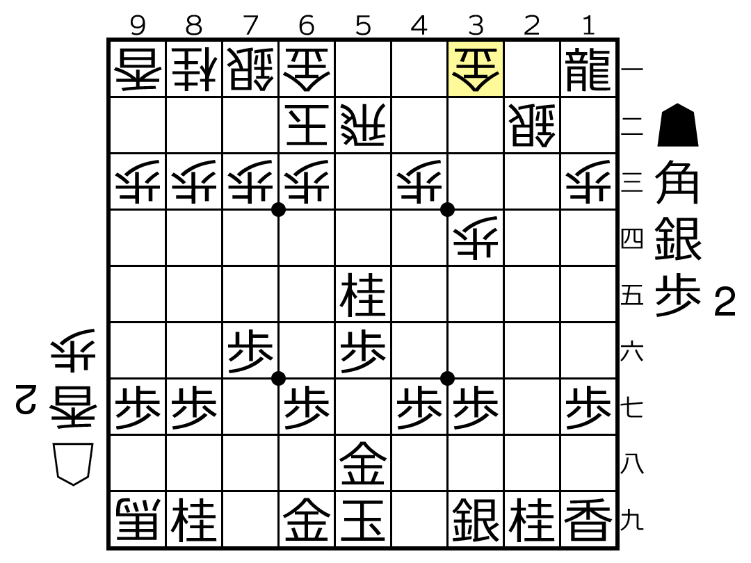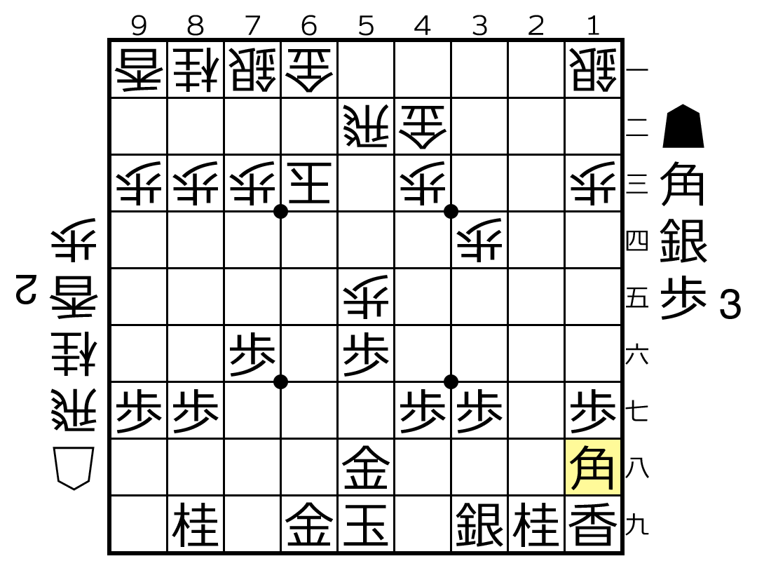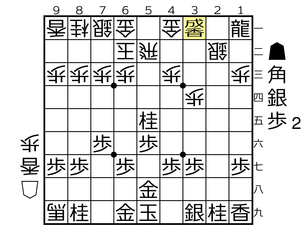 ここからはテーマ図周辺の変化を掘り下げていく。テーマ図は23手目の☗3三香の局面で、直前22手目の後手の指し手は☖9九馬。この☖9九馬に☗3三香以下の手順で後手が苦しいとなったので、☖9九馬を☖5四銀に代えたと言うのが第9図、最新型である。
