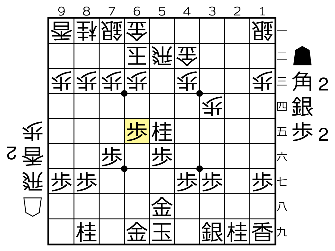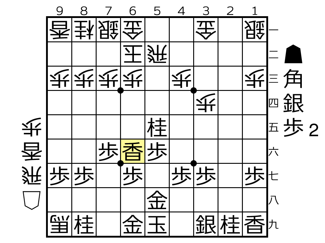 テーマ図の☗3三香以下、お互いに変化の余地はほとんどなく第6図まで進む。☗6六香(第6図)と打った局面で、後手は☖5四銀と打つ手が部分的な定跡だが、その銀は駒台ではなく1一の地点にある。とはいえ盤上の銀で☖7二銀と受けるのは☗4三桂成とされて後手がまずい。