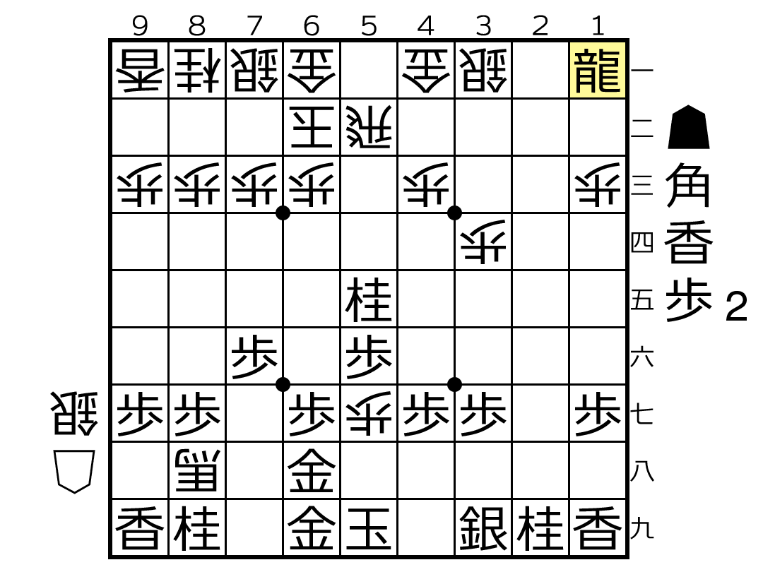 第4図は☗1一竜に☖8九馬と桂馬を取った局面。☖5七歩☗6八金寄の交換が入っていない従来型だと、☖9九馬と香車を取る手が定跡だった。ただし、第4図で香車を取ると☗7七桂と跳ねる手があり、これは☖5七歩の利かしが先手にプラスに働く展開になる。