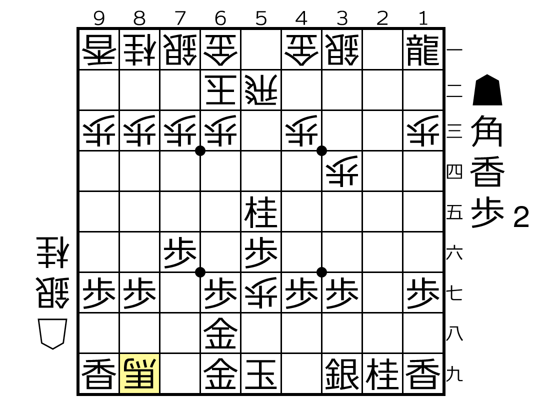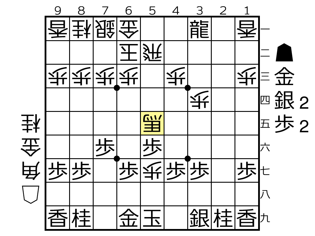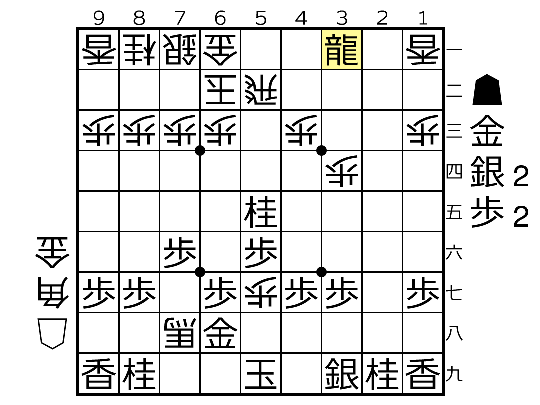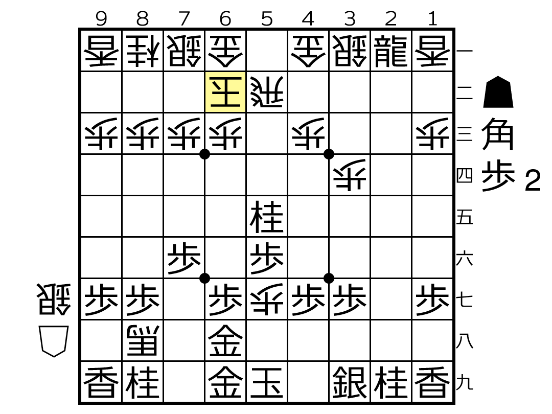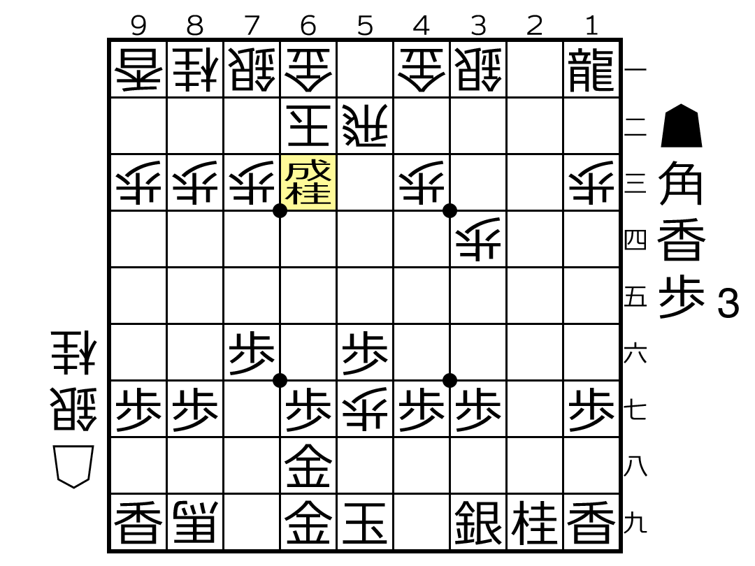 第4図では、☗2三角や☗6六香と力を貯める手も有力で、それは従来の定跡と似たような戦いになる。本テーマでは、いきなり☗6三桂成(第5図)と成り捨てる手が後手にとって怖い手なので詳しく見ていく。