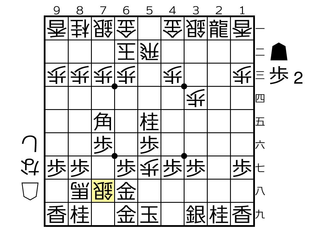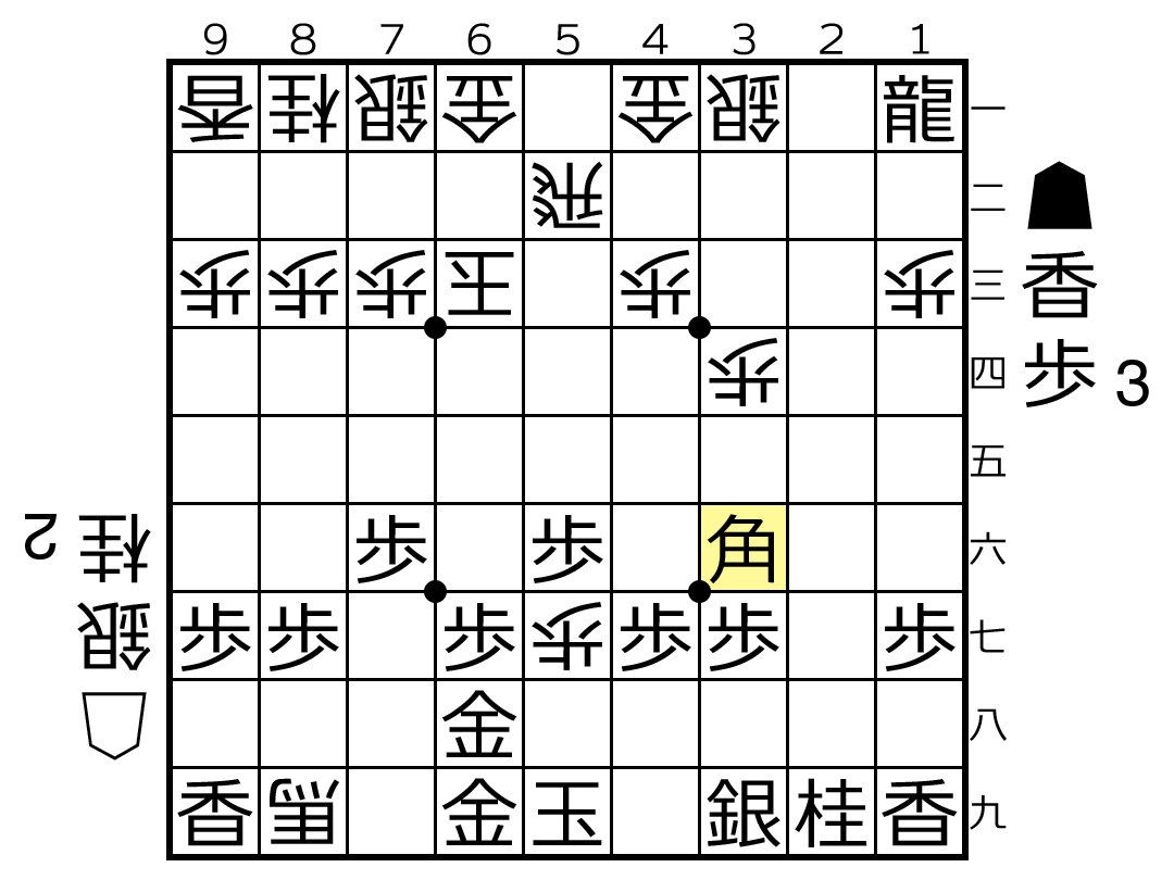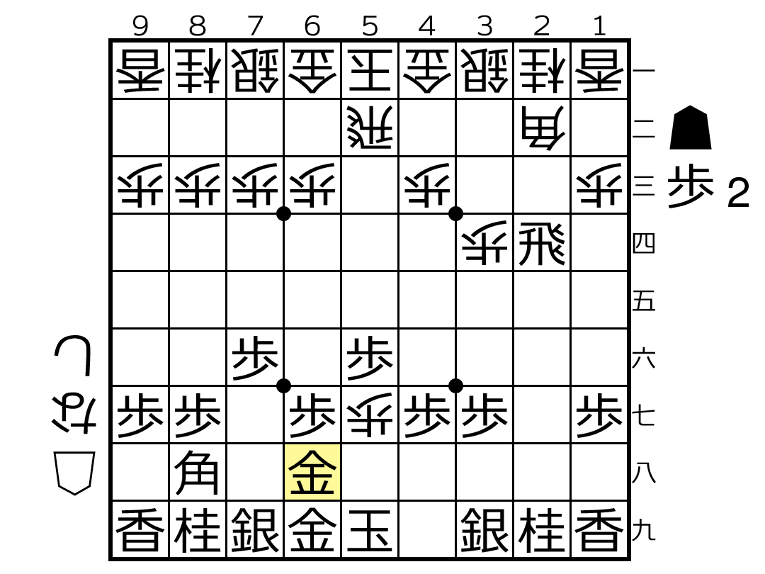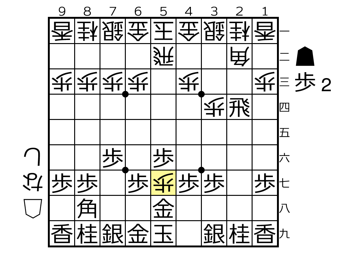 テーマ図の☖5七歩に☗同金は、☖3五角の飛車金両取りで先手がまずい。☗6八金寄と左にかわす手が定跡化された対応で、一局の将棋である。☖5七歩の拠点が残るので後手が得をしているように思えるが、実際のところどのぐらいの損得があるのかは不明。