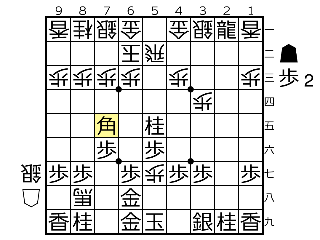 第2図では☗7五角(第7図)と打つ手もある。次に☗3一角成からの二枚替えを狙っているので☖5一飛か☖3二銀と受ける手が普通なのだが、これは従来の定跡と似たような進行になるので本記事では省略する。☖5七歩が先手玉頭に刺さっているこの形では、先手にとって嫌な筋があるのだ。
