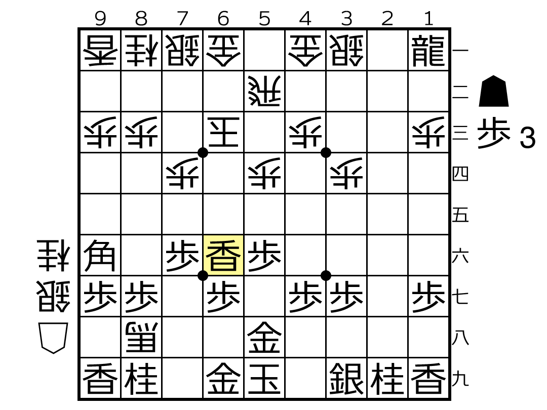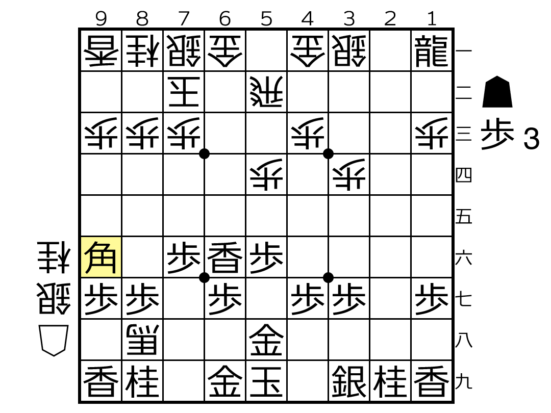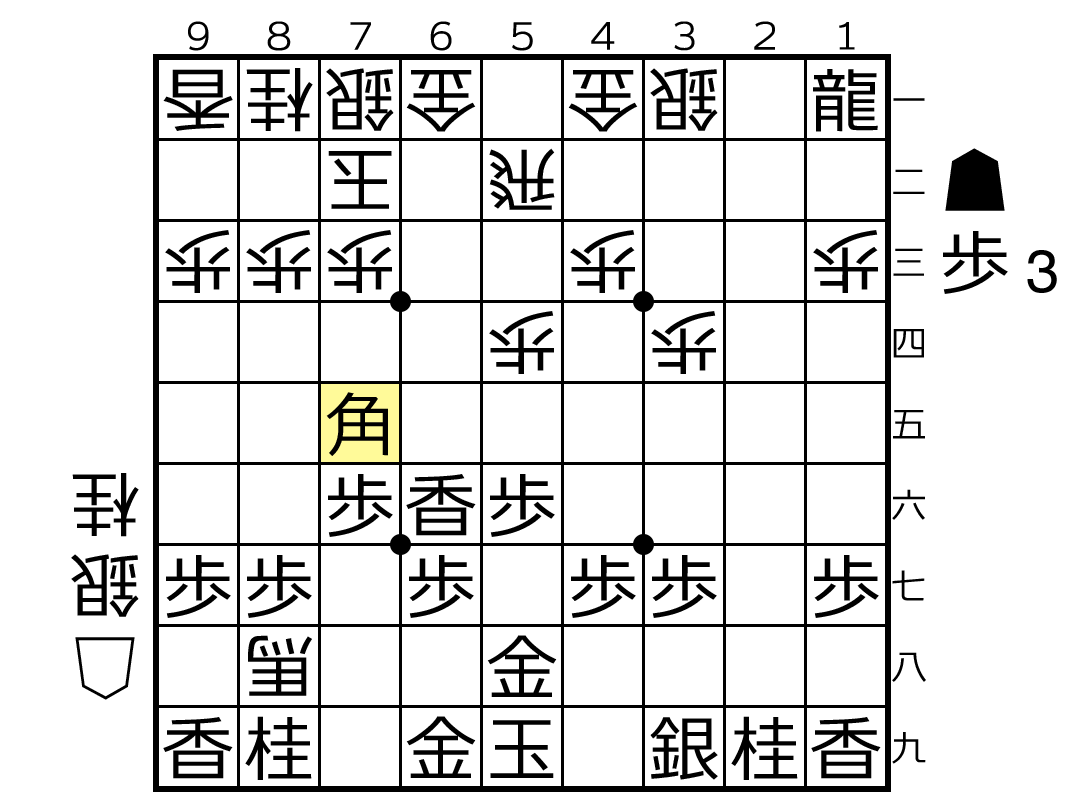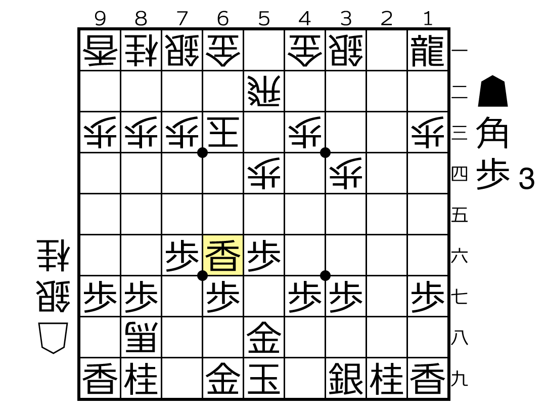 ☗9六角と☖7四歩の交換を入れず単に香車を打つと、☖7二玉と引かれて意外と難しい。第7図で☖7二玉ならば、☗7四角と出る手が次の☗6三香成を見て厳しいという理屈だ。図で☖6四桂には☗7五歩、☖7三玉には☗6一香成で先手好調。
