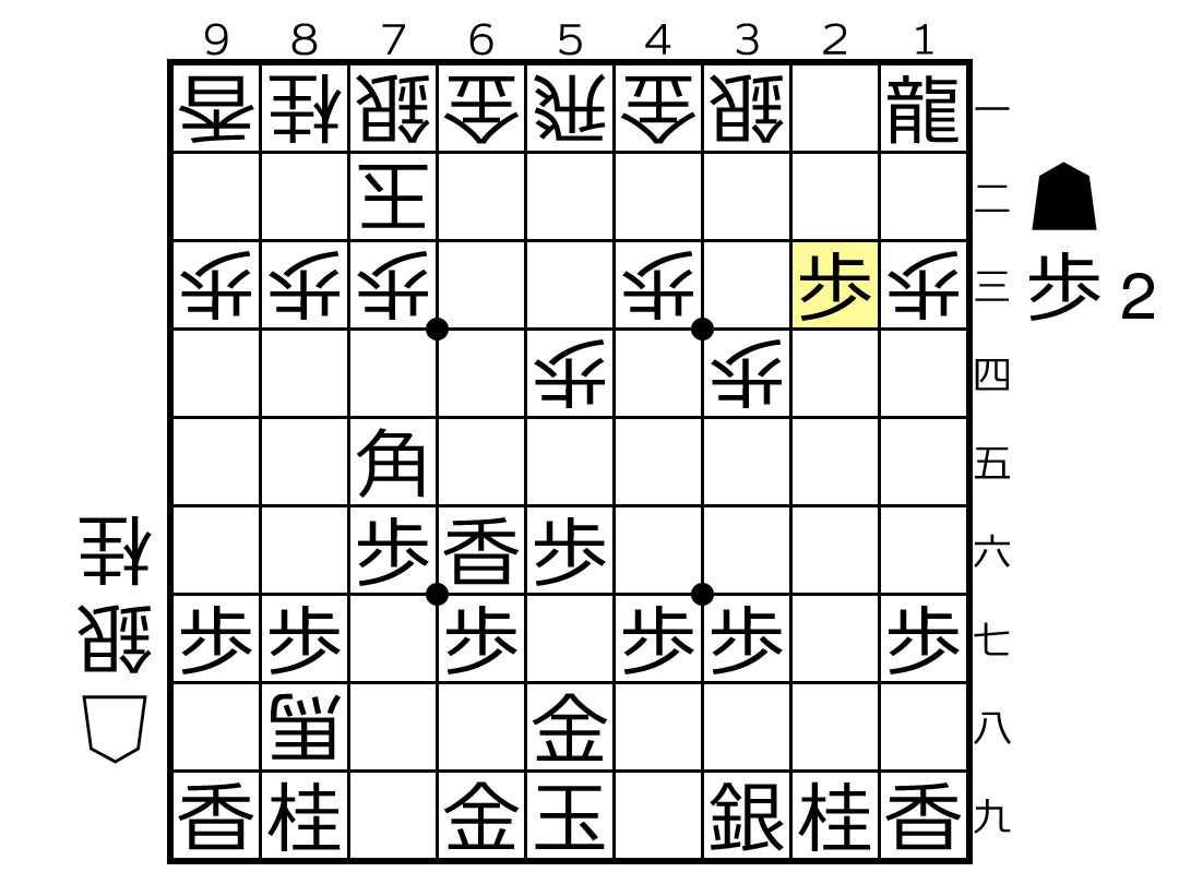 テーマ図の☖5四歩が指された1号局の将棋で、先手番の渡辺明竜王は☗6六香(第2図)と打った。歩切れの後手は☖6四歩と打つ歩がないので玉をかわす一手。☗6六香が遠く☖1一馬の竜取りを防いでいる意味もあって、一石二鳥の王手になる。