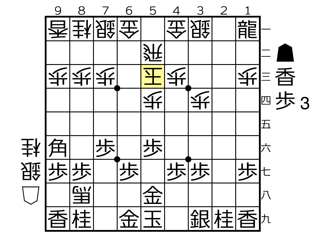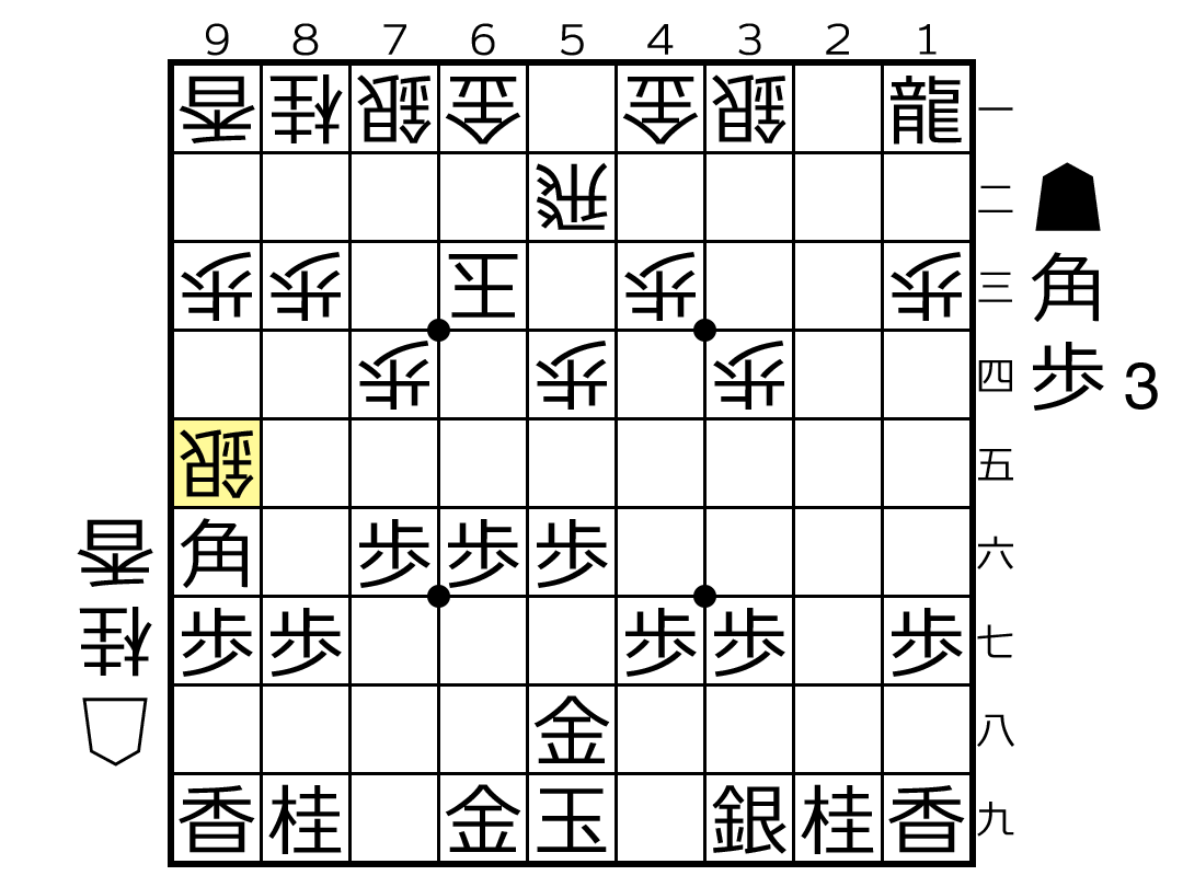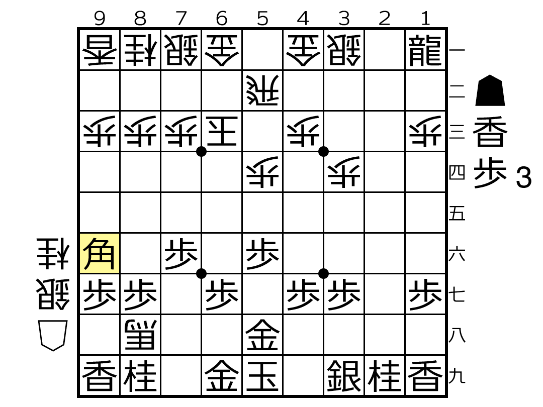 ☗9六角に☖5三玉(第9図)と寄る手は、佐藤康光棋王がタイトル戦の舞台で指した新手。玉を逃げるのなら☖7二玉と引いた方が安定しているが、この場合☗3一竜〜☗6三銀の王手が厳しい。第9図の☖5三玉は☗6六香の王手の他に、この☗6三銀の王手を受けている意味もある。