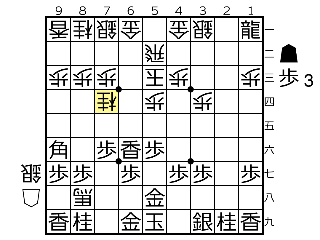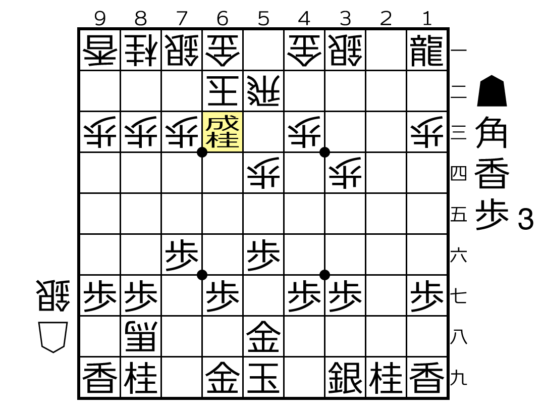 テーマ図の☖5四歩には☗6三桂成と成り捨ててしまうのが定跡です。ここで間違って☗4三桂成とするのは、☖1一馬☗5二成桂☖同金右で後手陣が安定してしまい先手失敗。